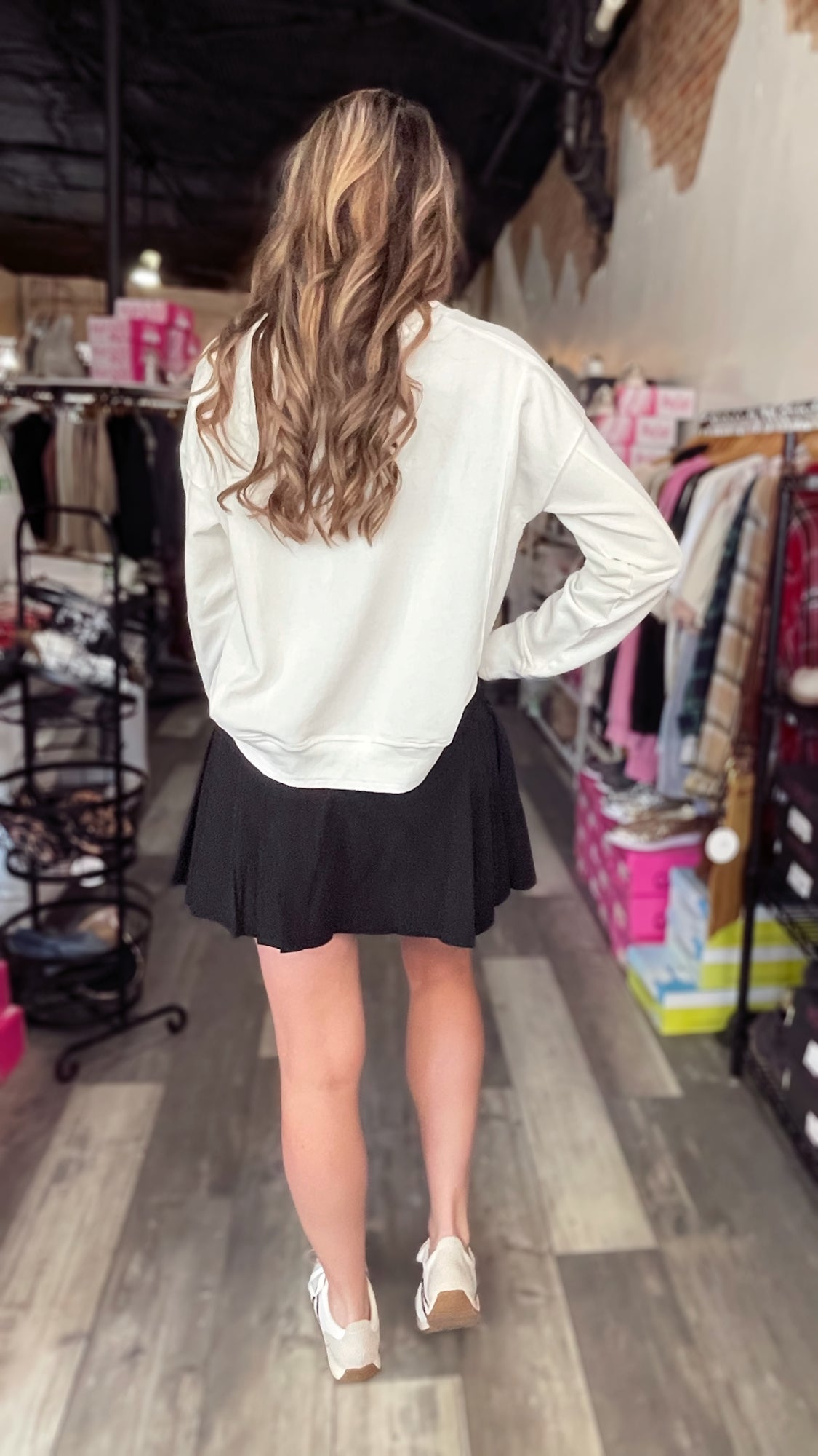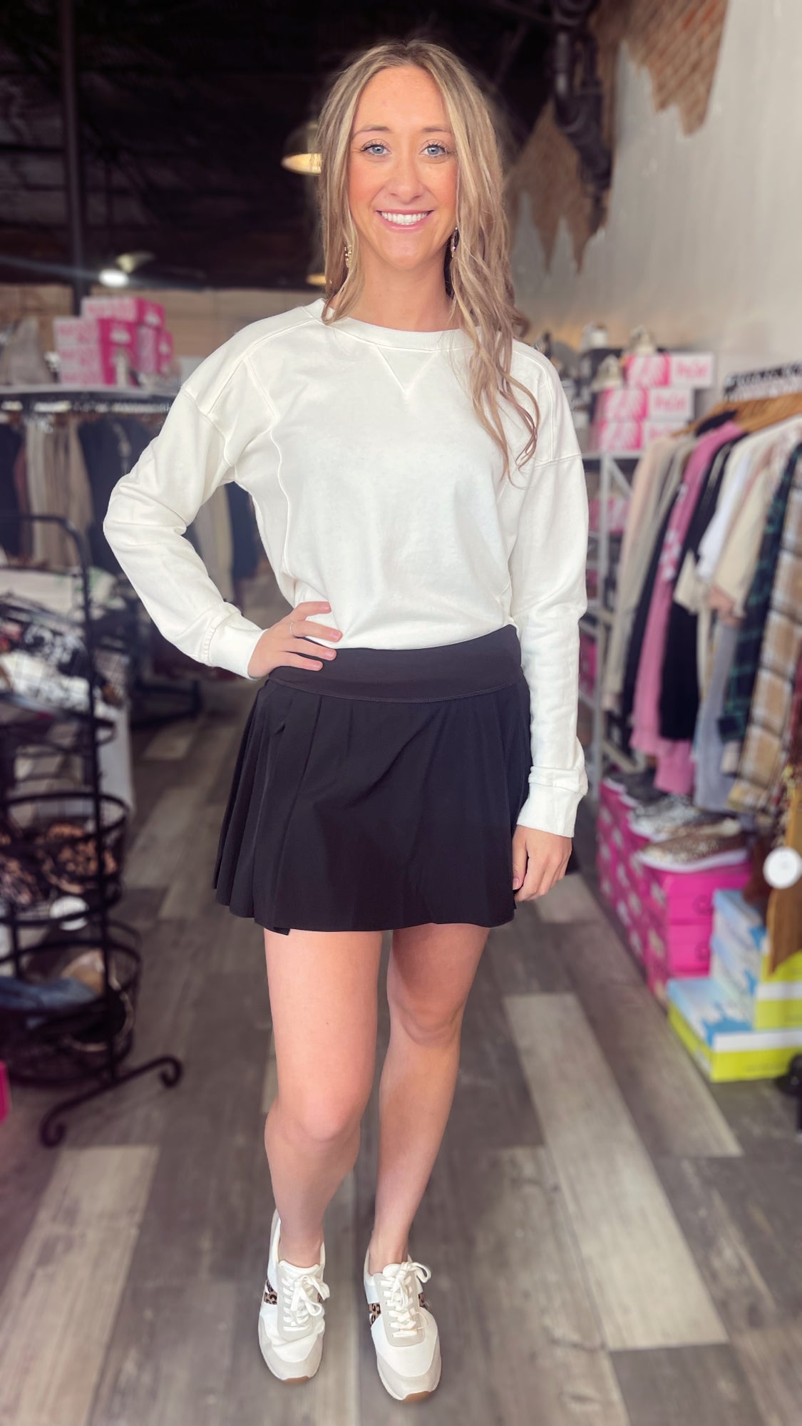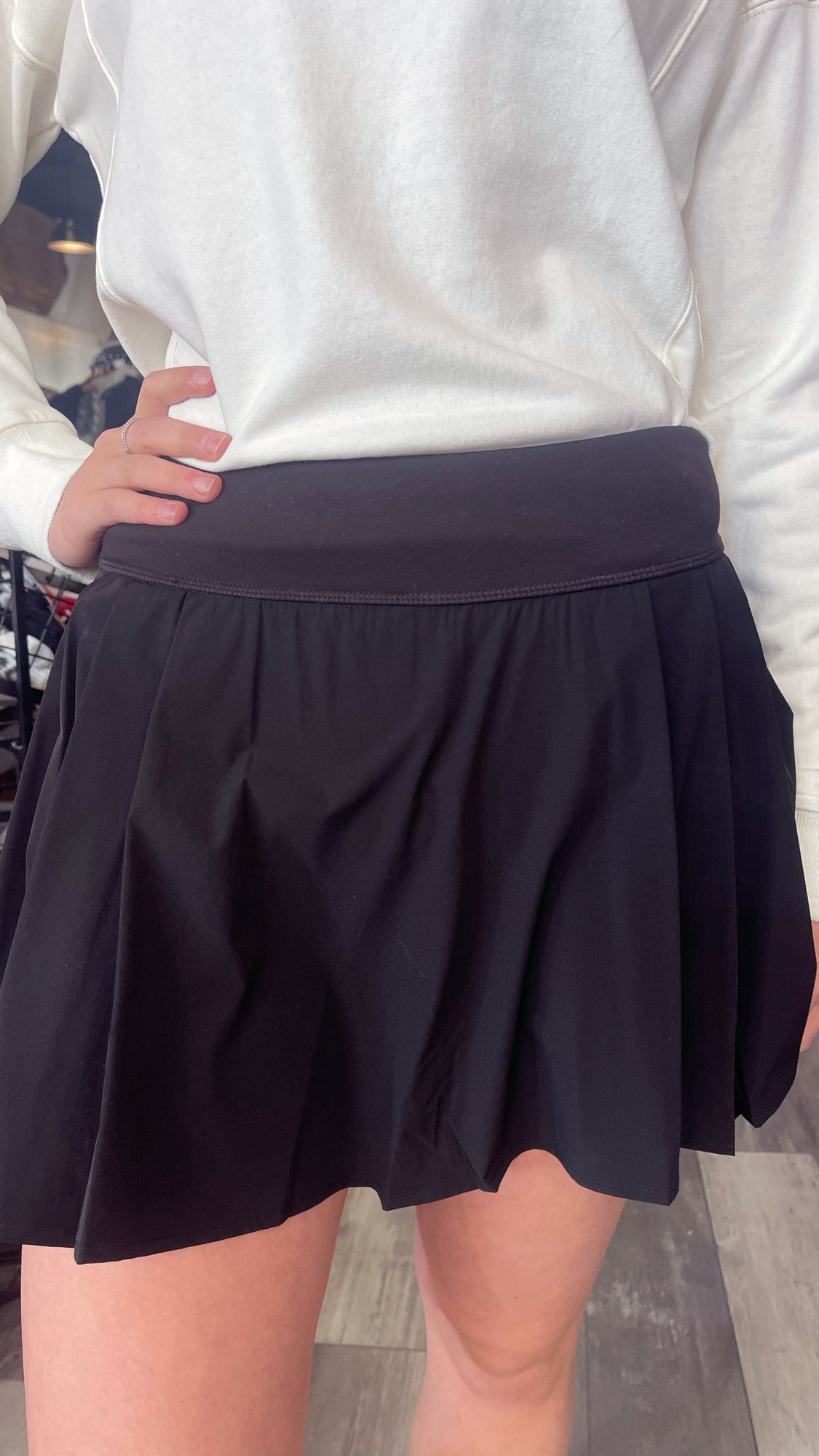 This little black skirt is so cute! It has built in shorts. The pleats are so flattering and it’s the perfect length. It is 90% Nylon and 10% Spandex so it will wash well. Darcy is wearing the small.