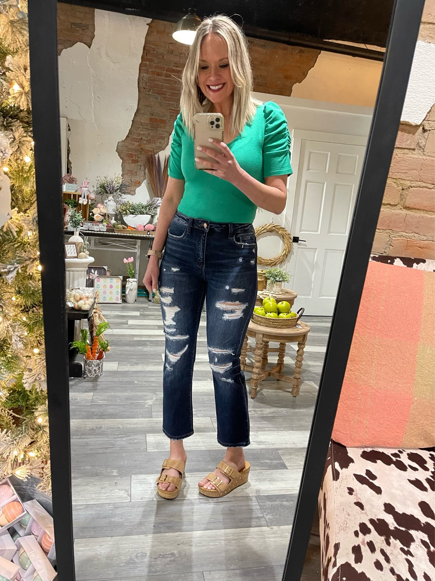 These super high rise flying monkey jeans are perfection.The fit is true to size. Love the darker denim and the distressing.