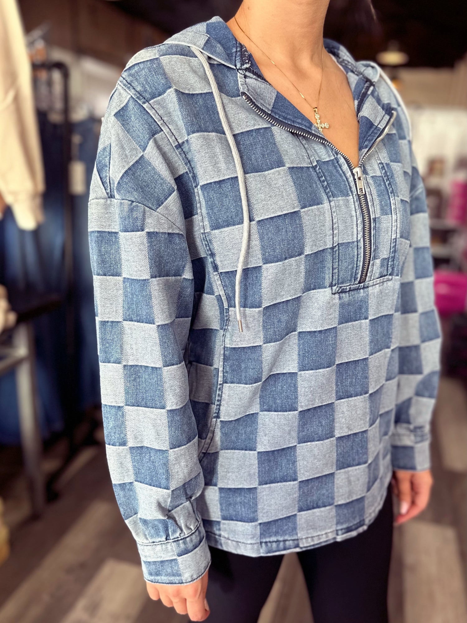 How adorable is this checkered denim hoodie?! We are obsessed! It has the perfect oversized fit.
