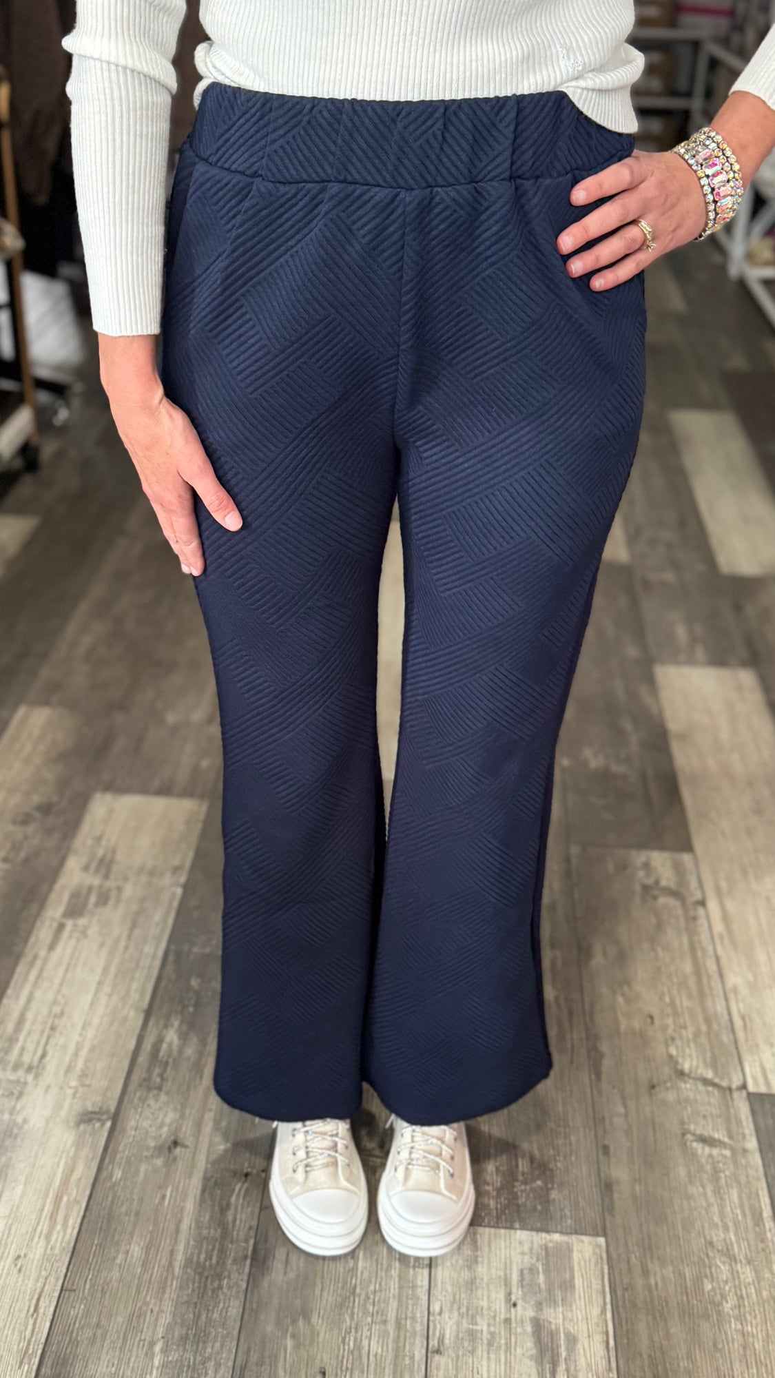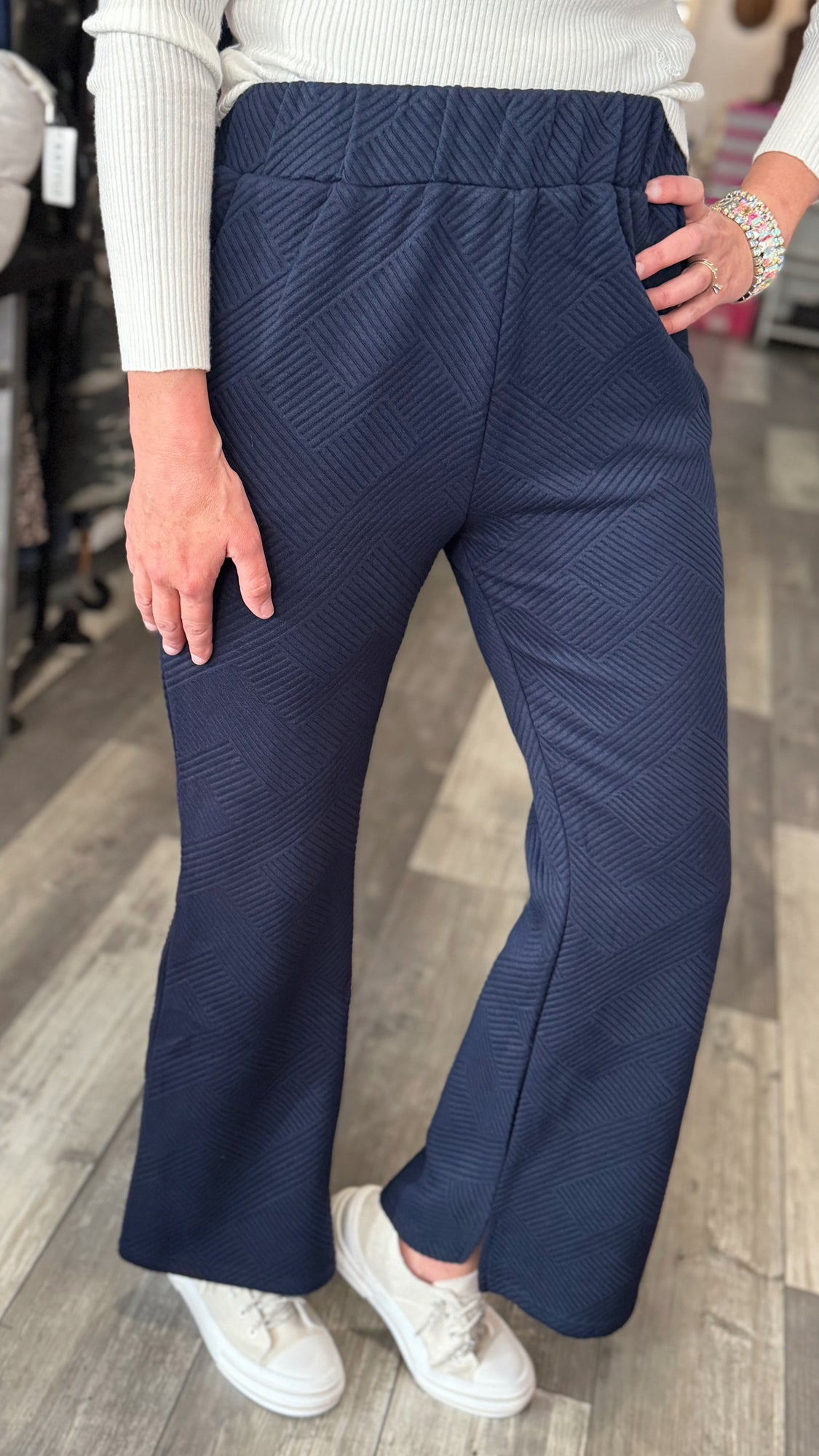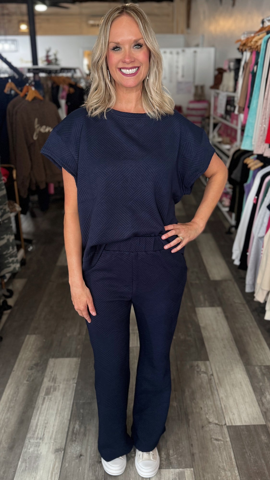 This navy set has the sweetest texture detail. Kate is normally a size 5 in bottoms, is 5’8” and is wearing the size Medium. These sets are very versatile and can be worn individually as well, we have also paired it with our basic cream sweater (sold separately).