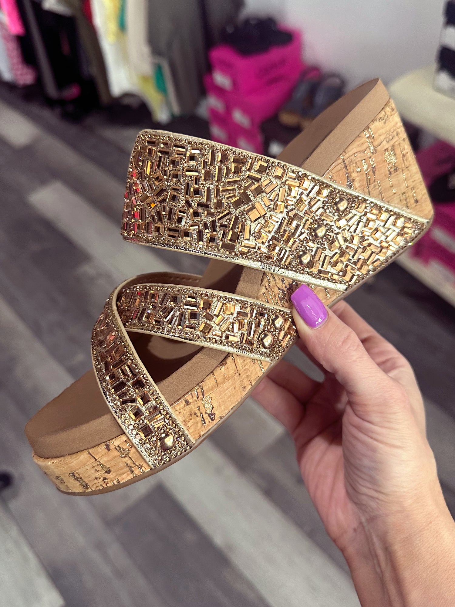 These wedges by our favorite Corky’s’ brand are the most comfortable wedges you’ll ever wear, perfect for all day! They are true to size. The gold sequined detail is a show stopper.