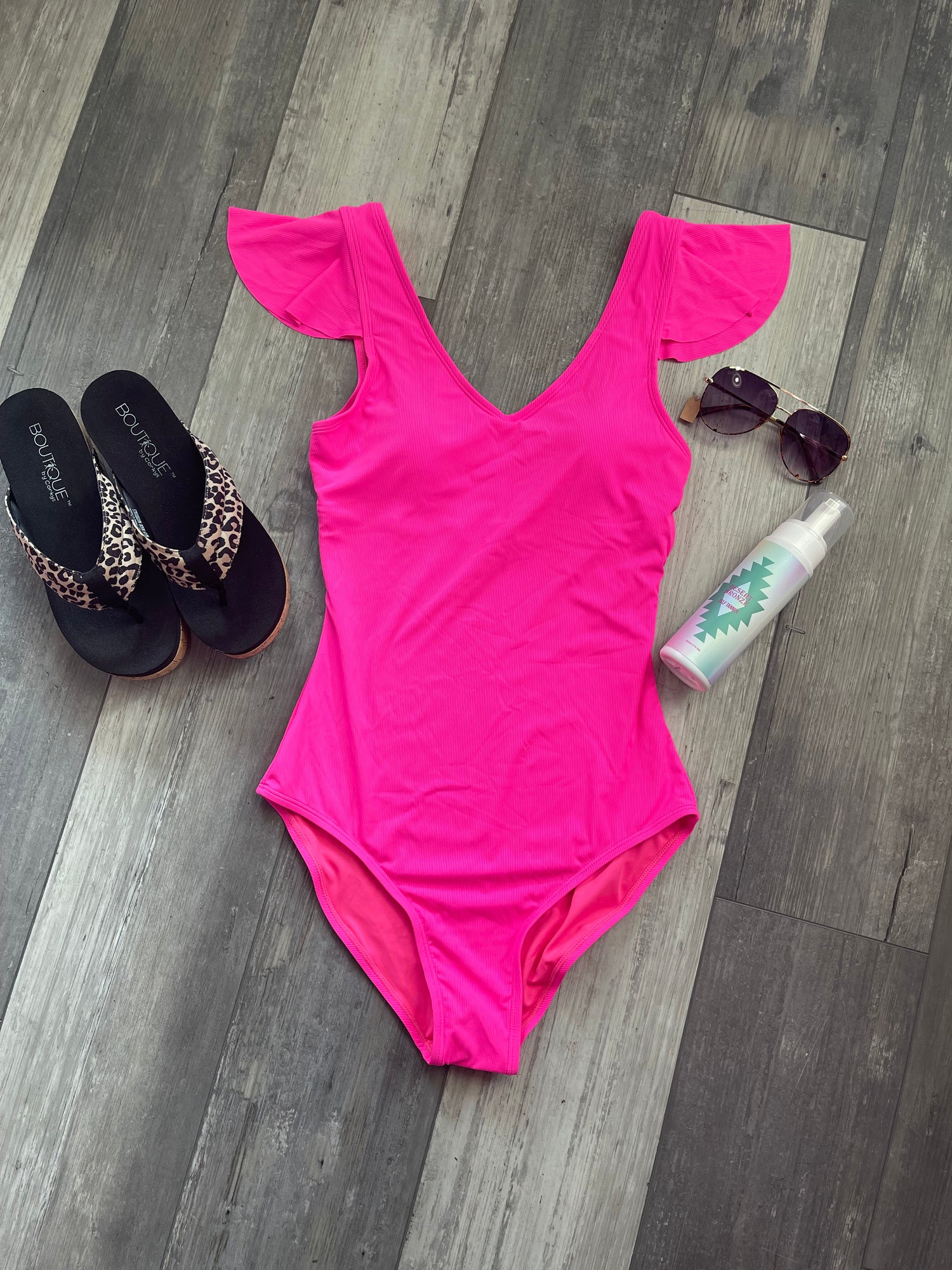 This one piece is perfection! The coverage is perfect. Covers your booty but still cute and sassy!!! We love the black and hot pink! The ruffle shoulders are so sweet and the ribbed material adds dimension. This is swimwear you are going to want to live in!