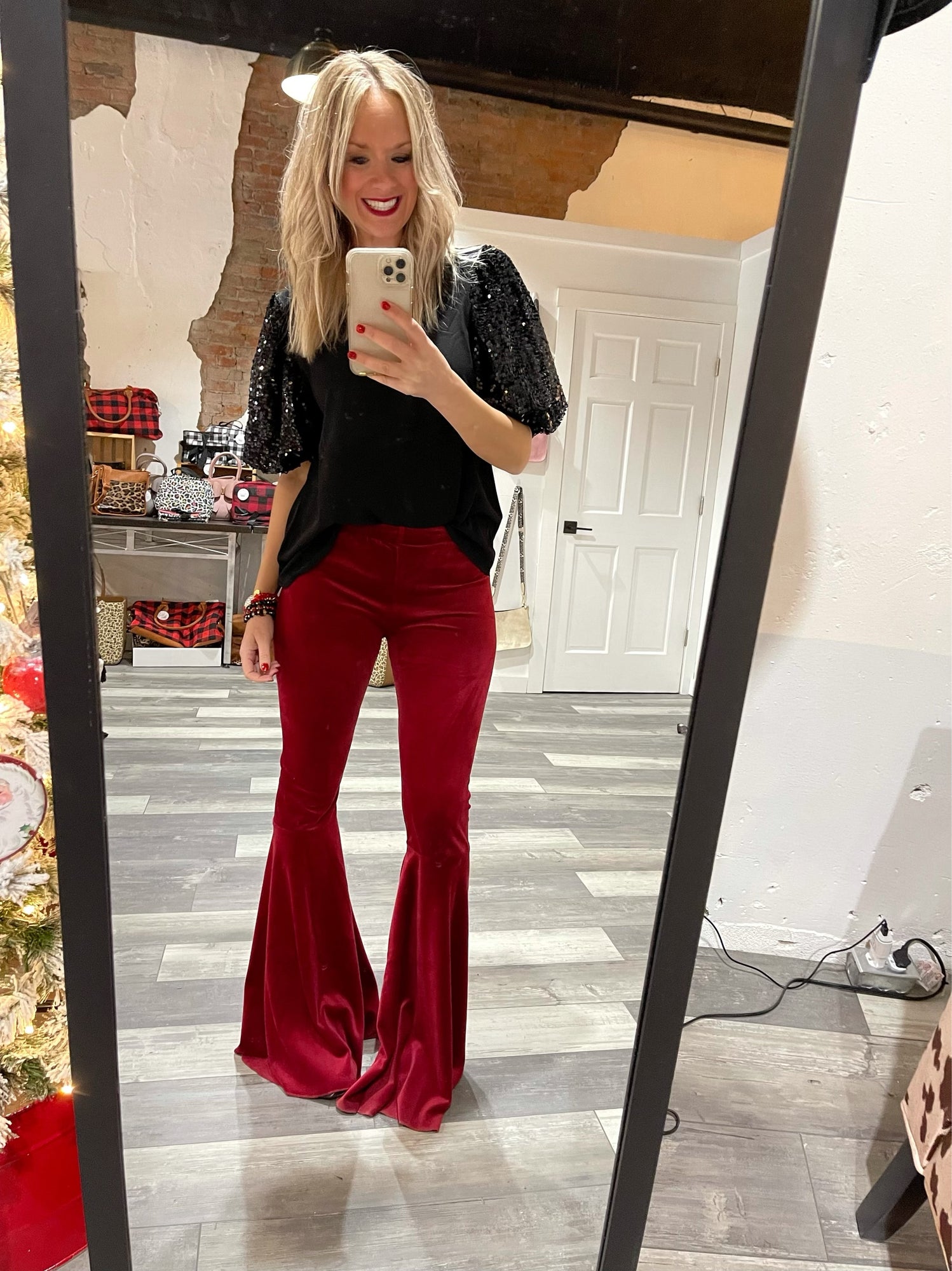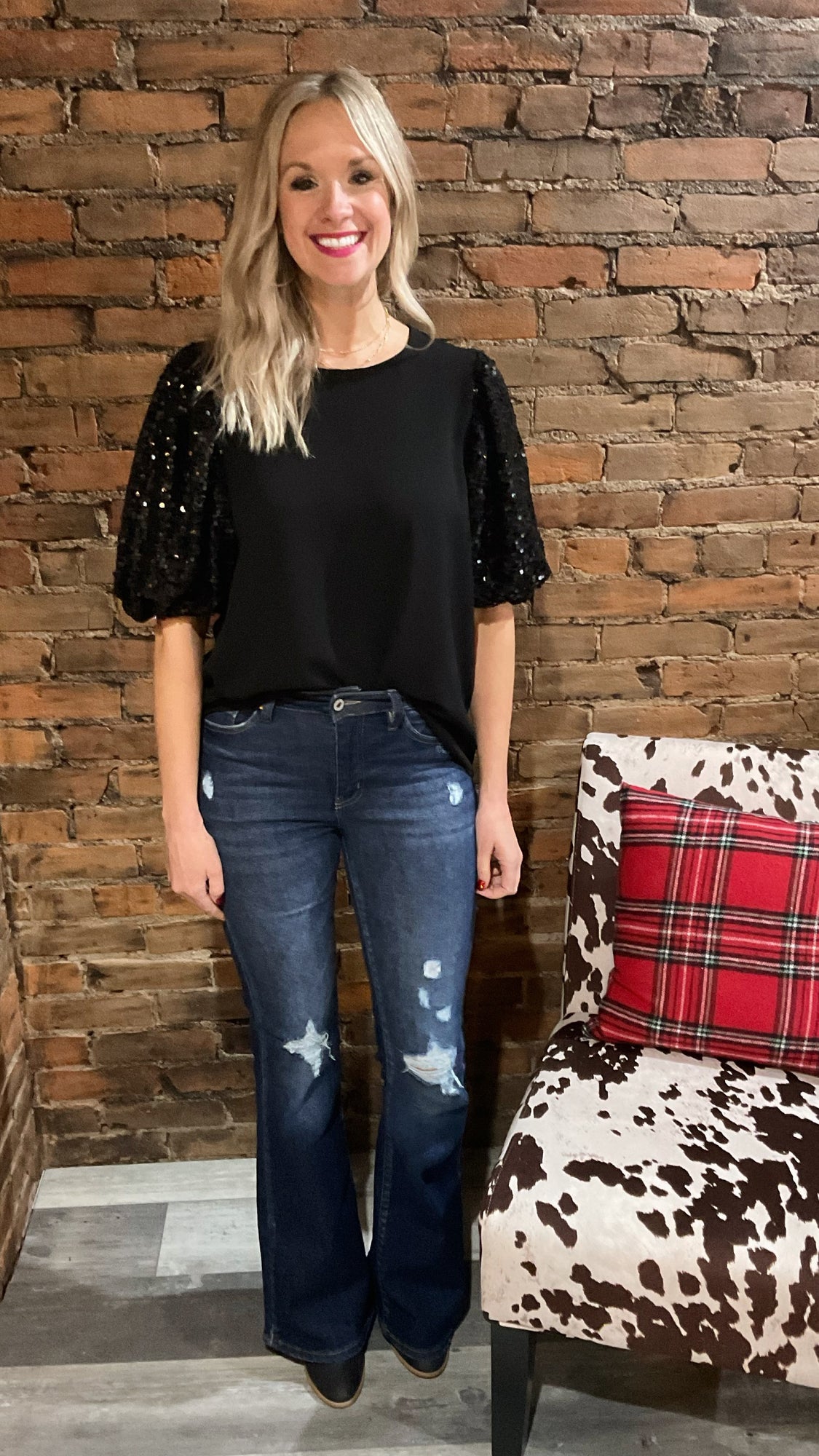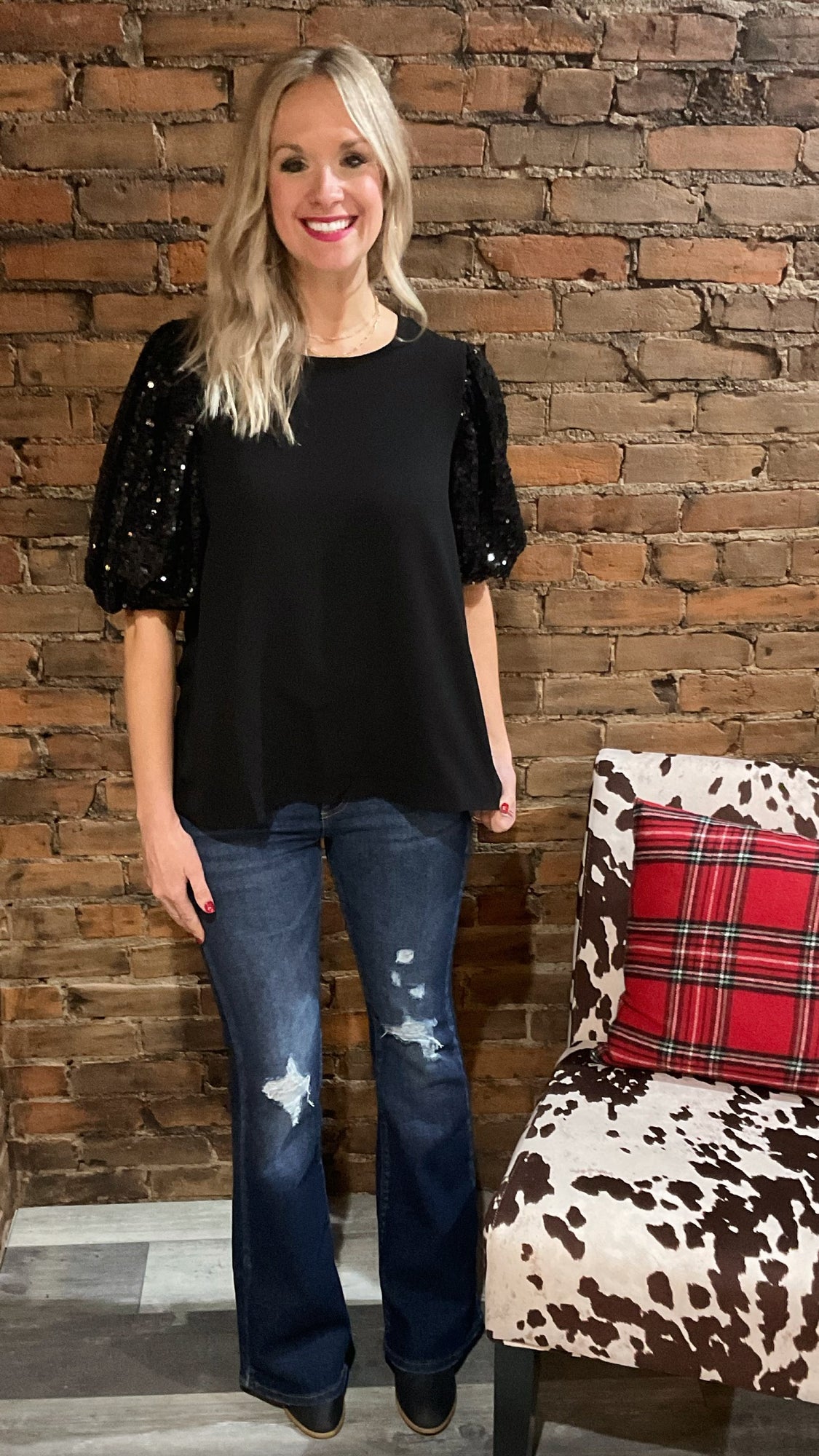 This top will be a show stopper for sure! The sleeves are puffy with black sequins! Fit is true to size.