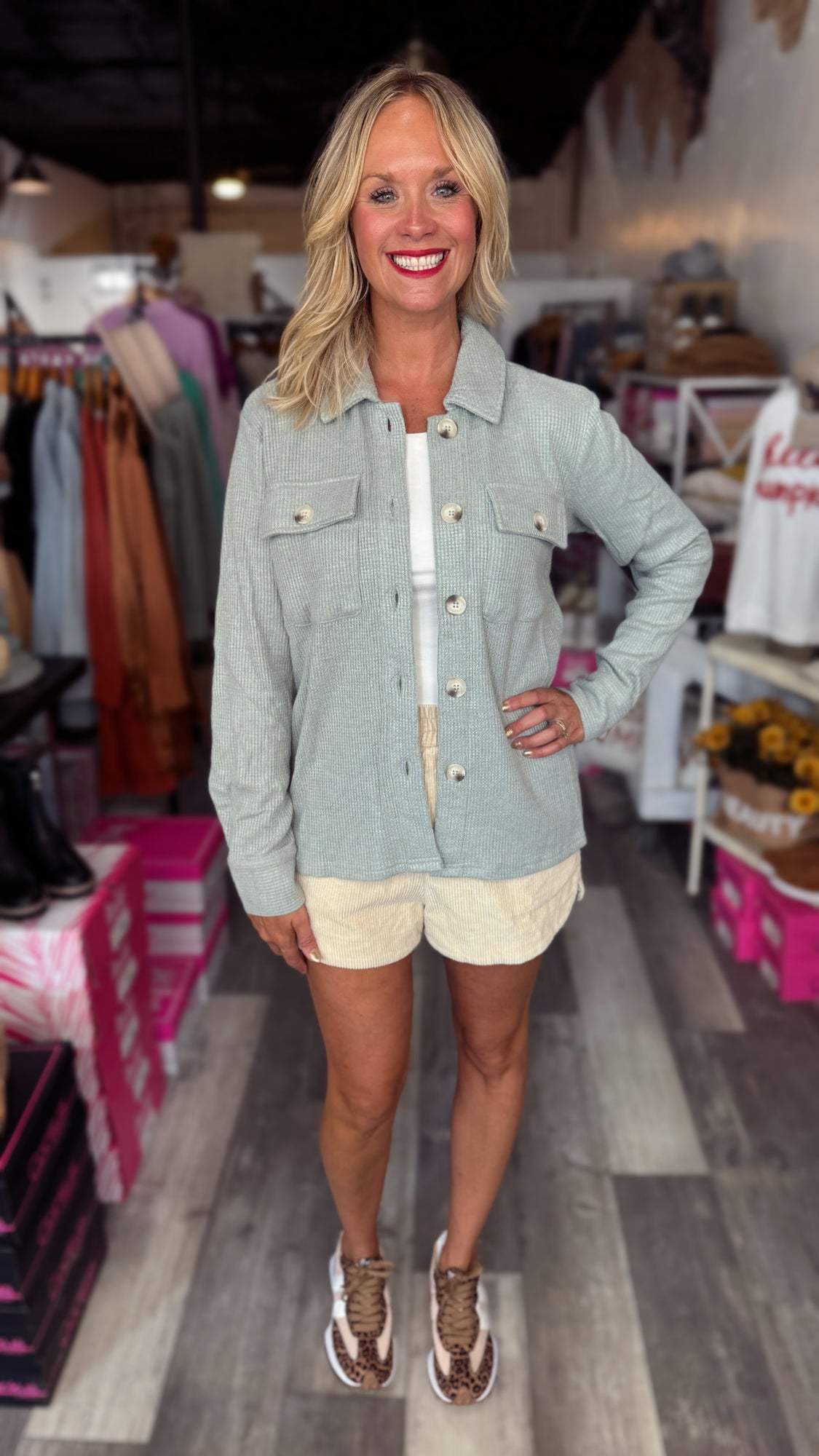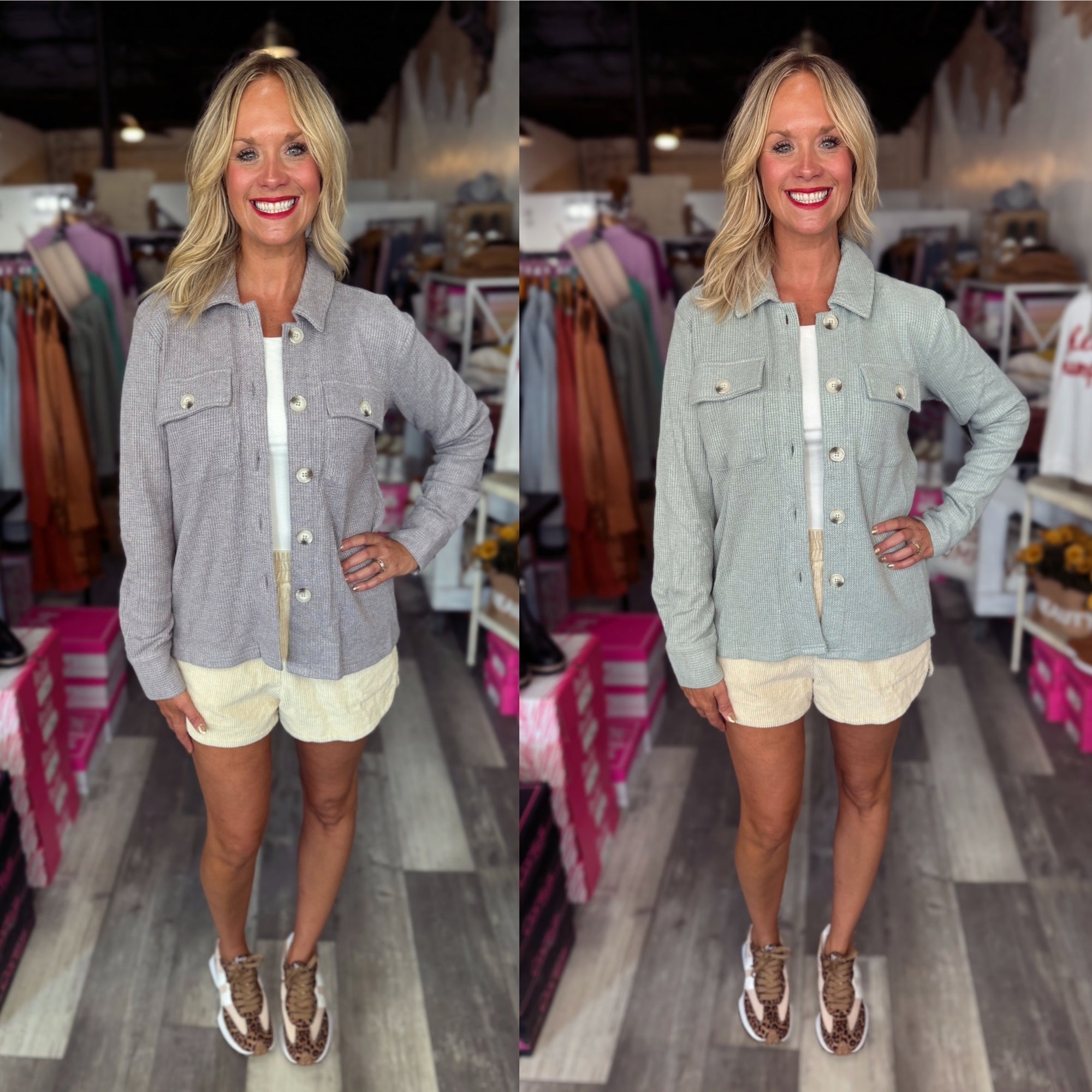 This waffle knit button down jacket will be a staple in your closet! It’s so comfortable, high quality and super soft!! Comes in 2 colors: Sage Green & Grey……only question? Which one……BOTH!