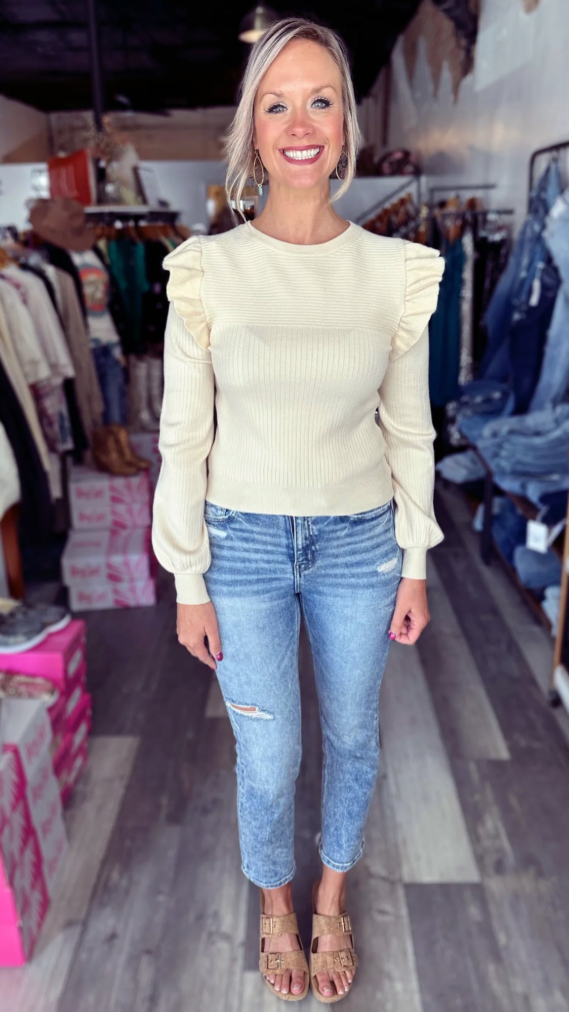 This sweater is the cutest! Choose between black or cream…..or BOTH! They will be your go to all fall and winter! Kate is wearing her usual size small.