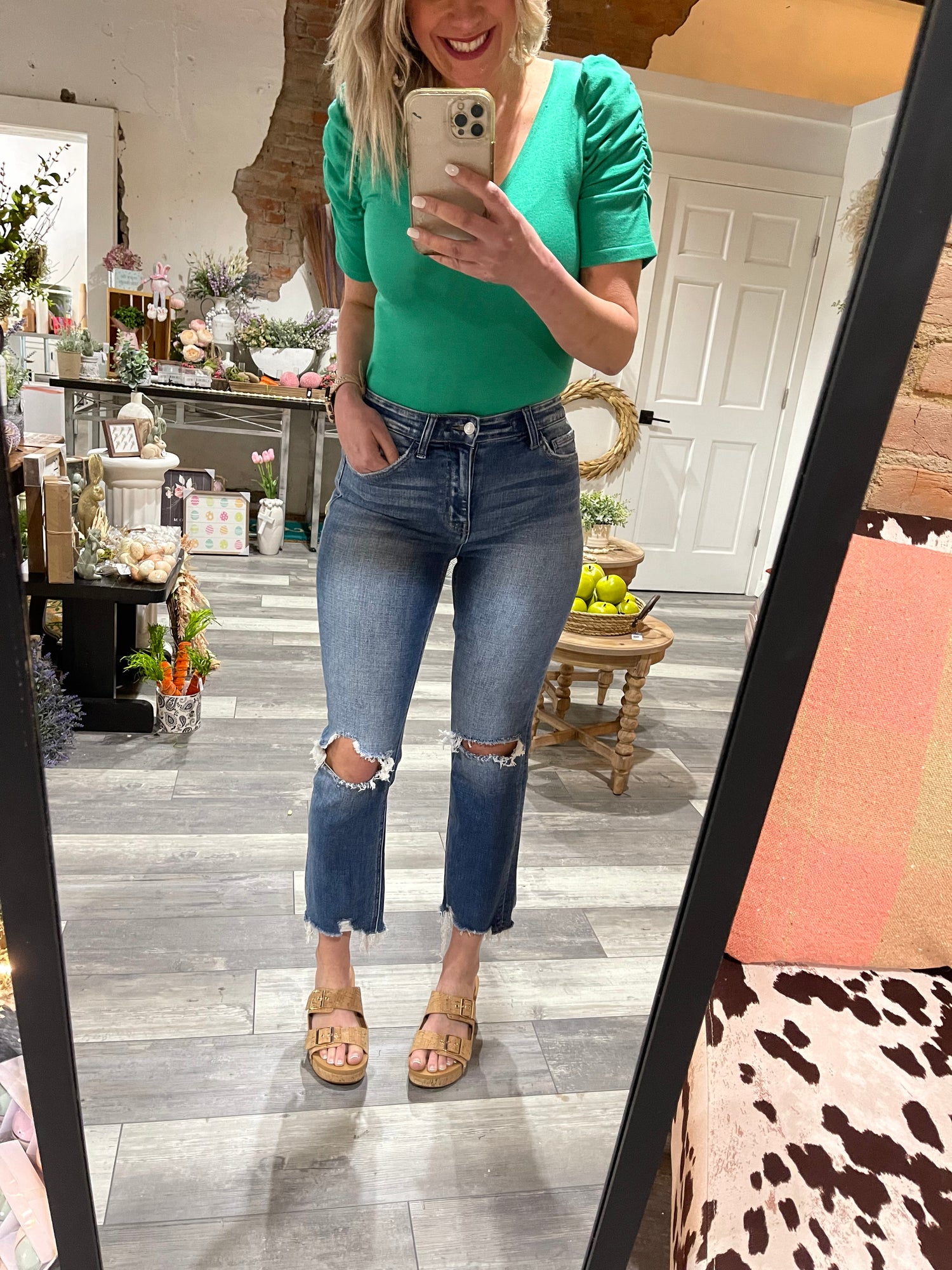This sweet green bodysuit is adorable. The puff ruffled sleeves are so fun. The bodysuit does fit snug so if between sizes we recommend sizing up. Kate is wearing the S/M.