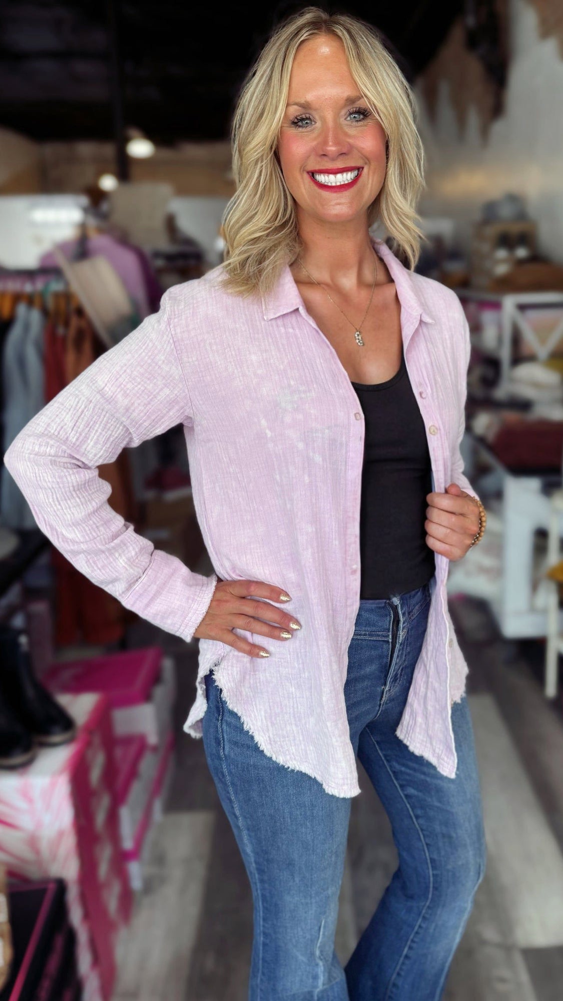 This button down top is super lightweight and so soft. We love the soft lavender color and the length is perfect! Kate is wearing her usual size small.