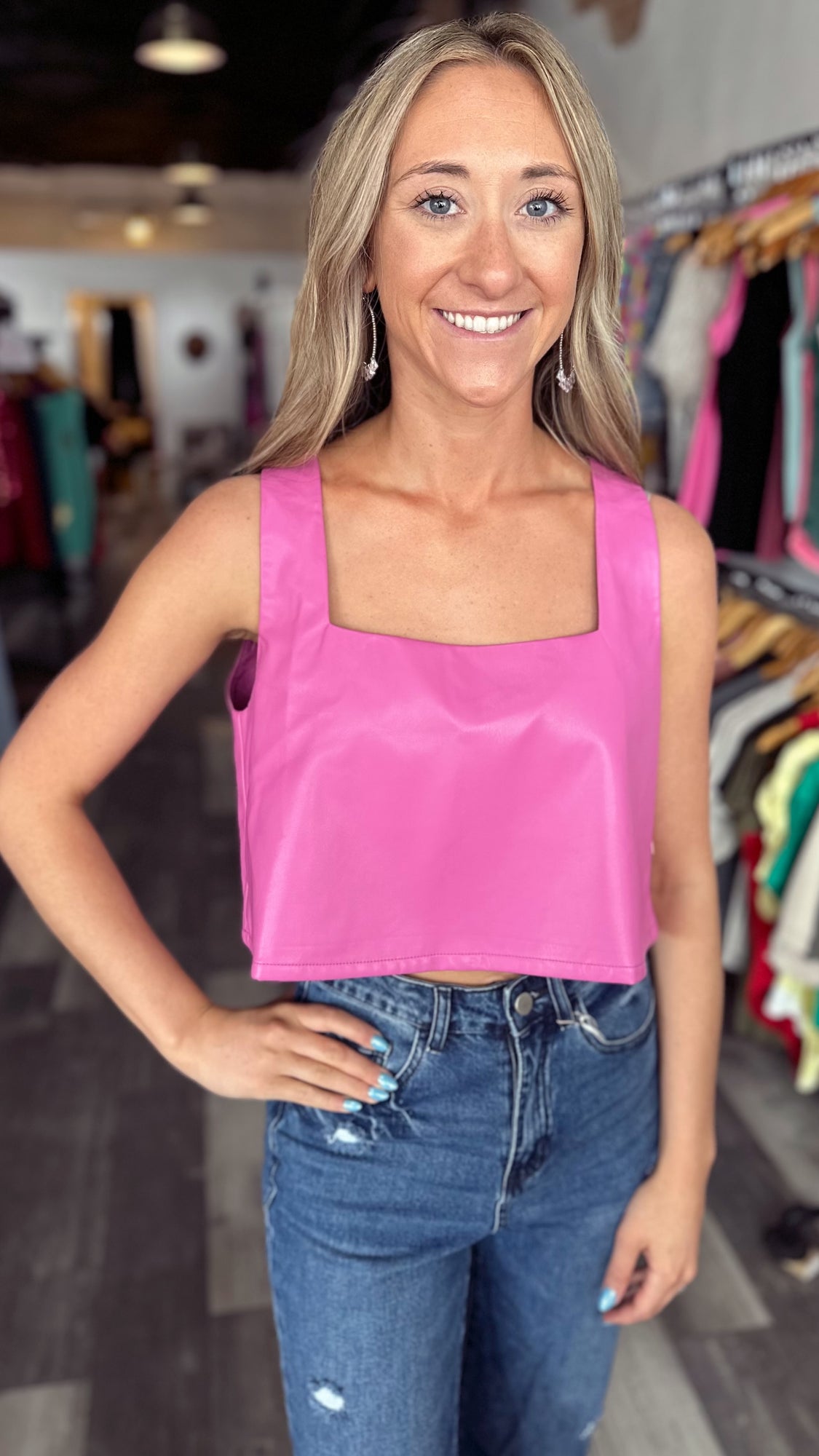 This pink leather cropped top has the cutest fit. The perfect length to pair with high rise bottoms. Comfy and true to size.