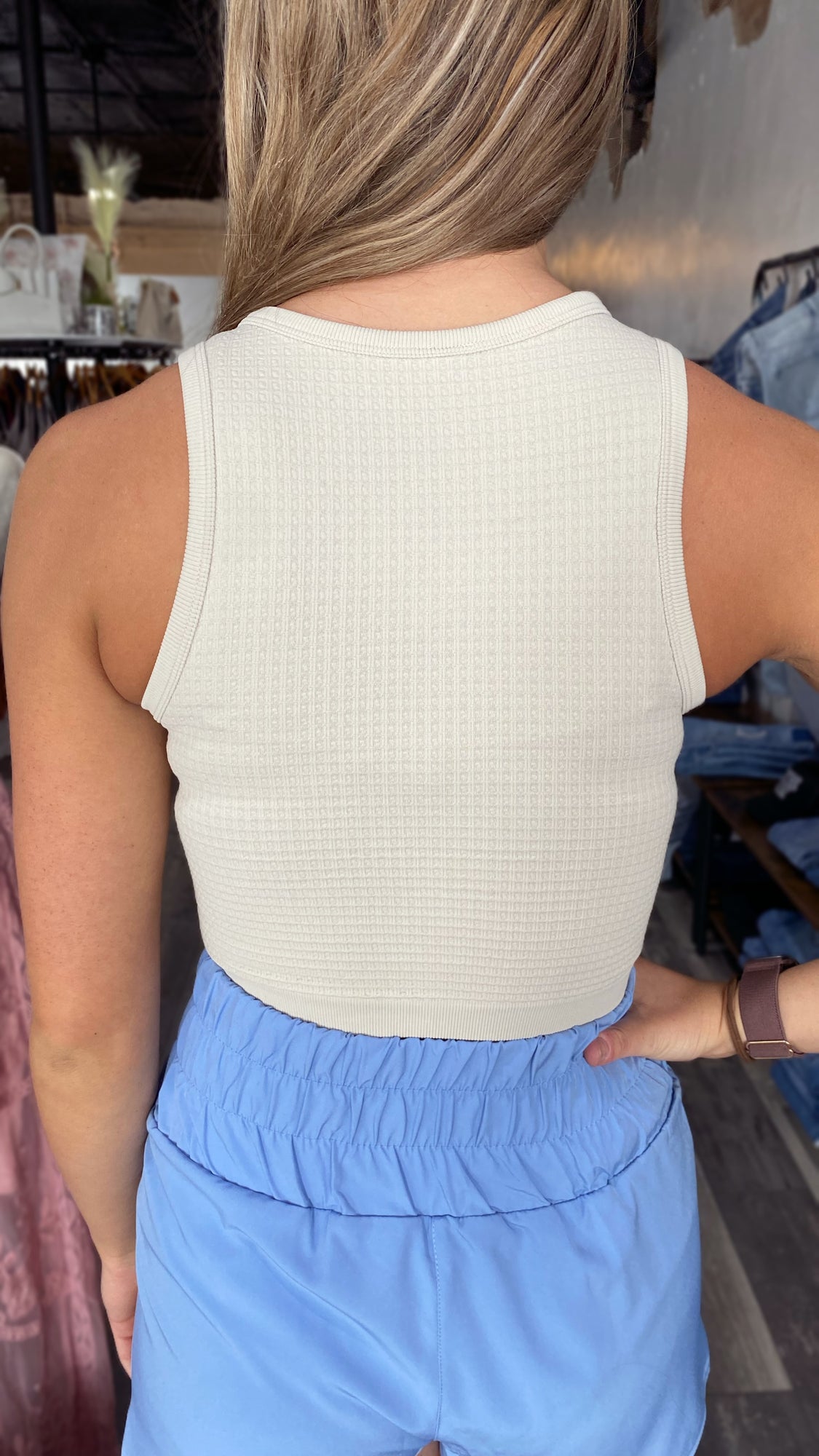 We love these waffle knit cropped tanks! Super cute with some high rise shorts or perfect for layering! This is a great neutral color! Fit is true to size. Darcy is normally a size small in tops and she is wearing the S/M