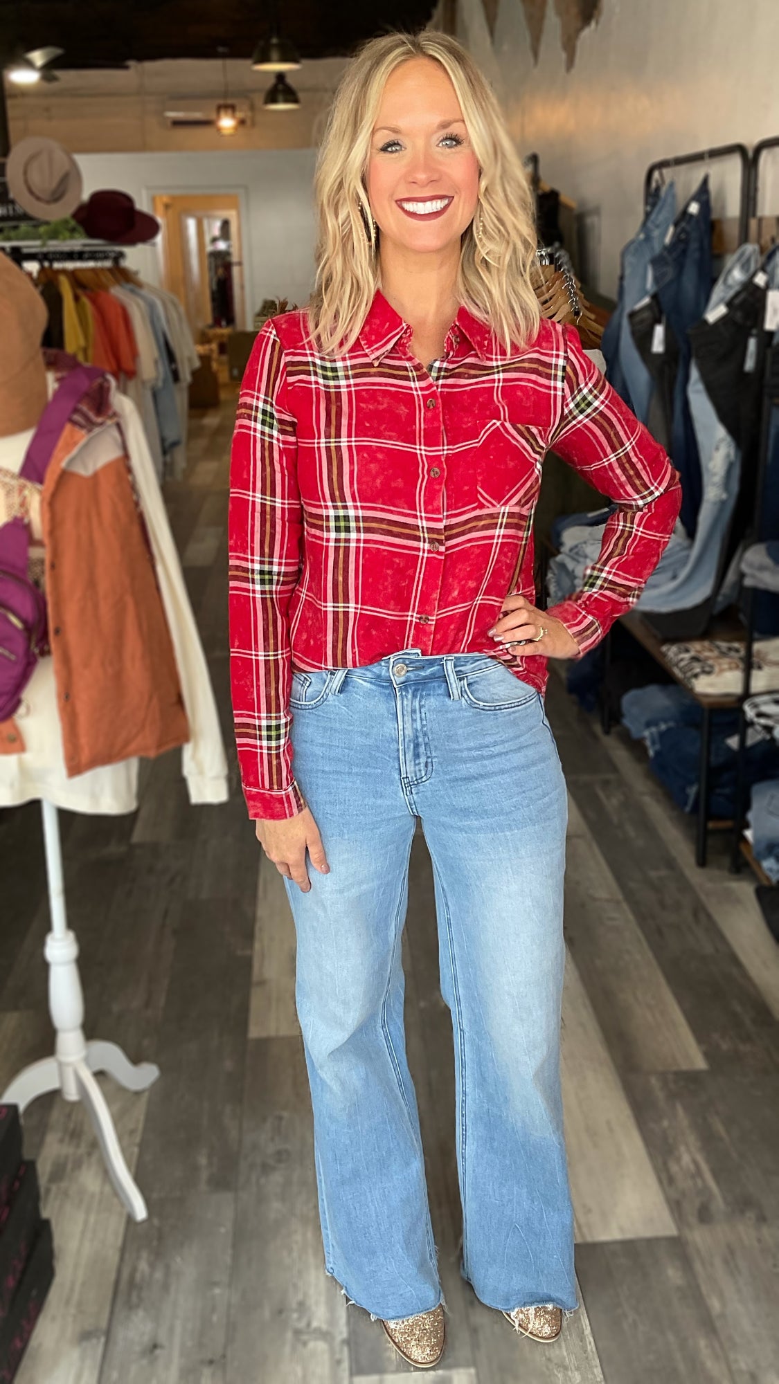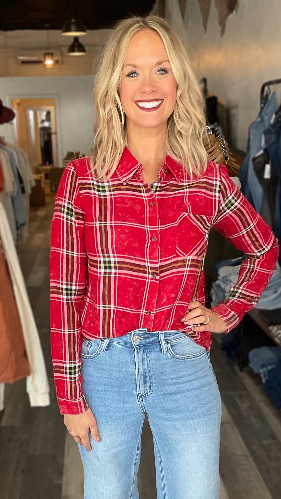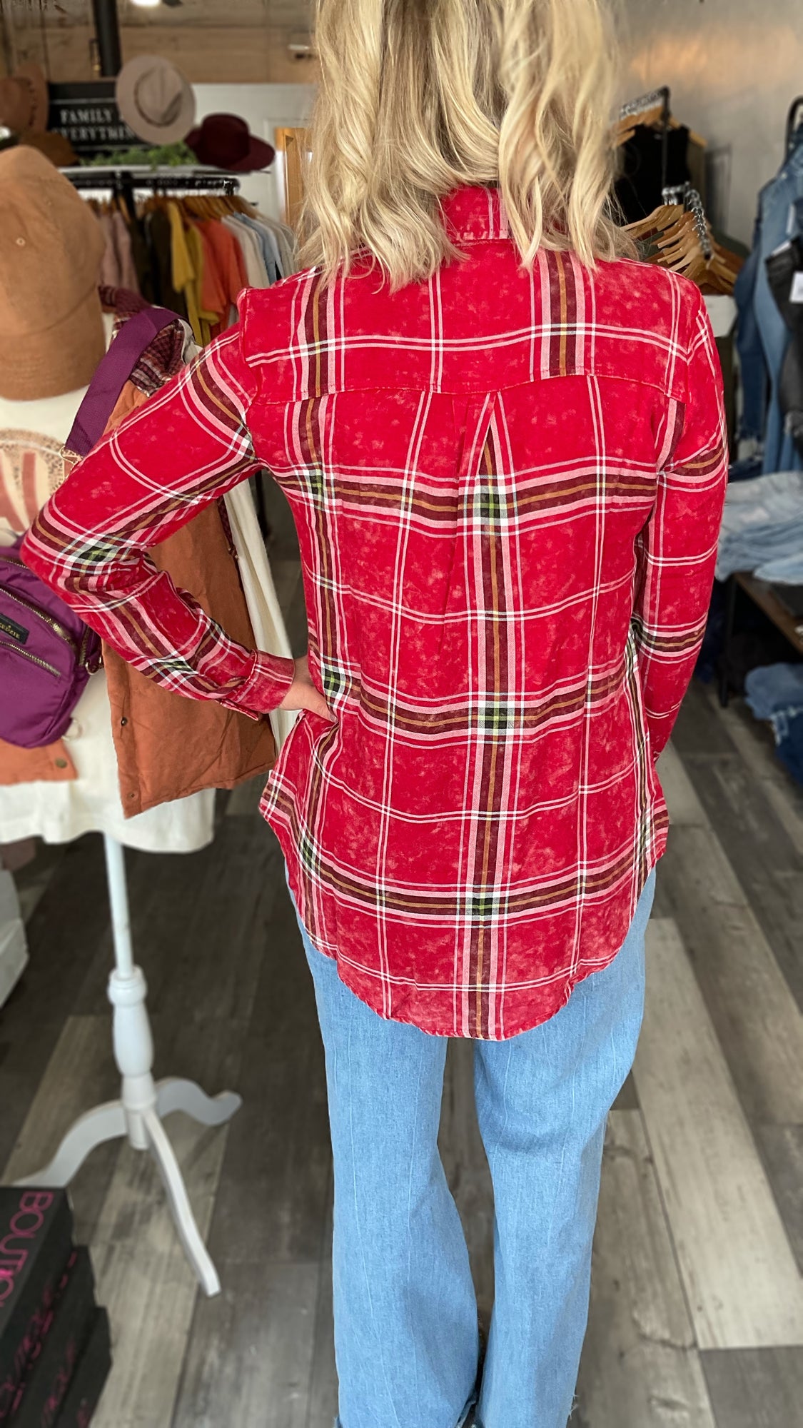 This plaid button up is buttery soft and light weight! We love the washed red and that it is longer in the back. Fit is true to size, however, if you are between sizes we do recommend sizing up as there is very little stretch.