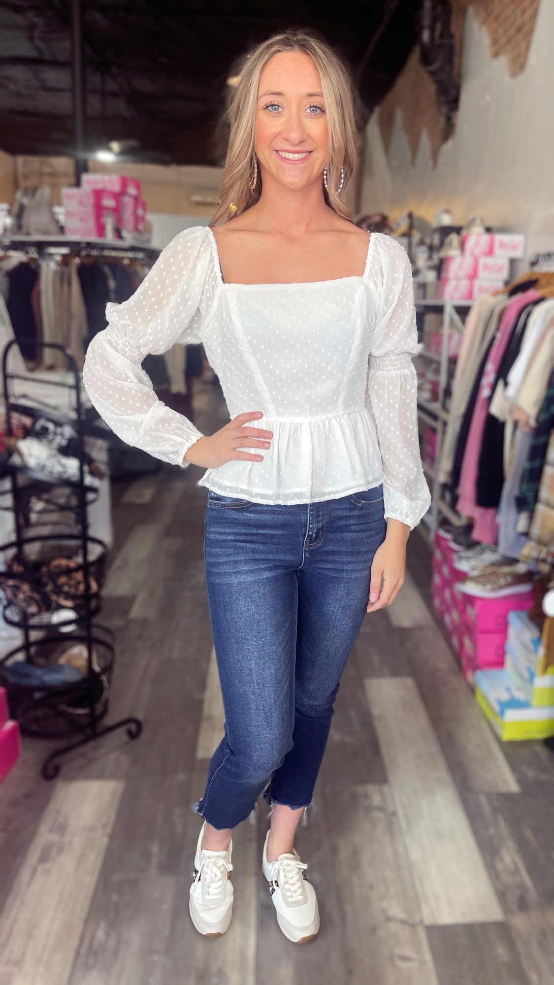 This white smocked top is very cute and timeless!! We are thinking for any spring and summer occasion! Darcy is wearing the small.
